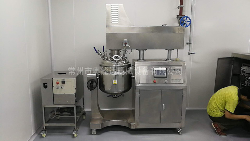 物料在水鍋、油鍋內(nèi)通過(guò)加熱、攪拌進(jìn)行混合反應(yīng)后,由真空泵吸入乳化鍋,通過(guò)乳化鍋內(nèi)上部的中心攪拌、聚四氟乙烯刮板始終迎合攪拌鍋形體,掃凈掛壁粘料,使被刮取的物料不斷產(chǎn)生新界面,再經(jīng)過(guò)葉片的剪斷、壓縮、折疊,使其攪拌、混合而向下流往鍋體下方的均質(zhì)器處,物料再通過(guò)高速旋轉(zhuǎn)的切割輪與固定的切割套之間所產(chǎn)生的強(qiáng)力的剪斷、沖擊、亂流等過(guò)程,物料在剪切縫中被切割,迅速破碎成200um-0.2um的微粒,由于乳化鍋內(nèi)處于真空狀態(tài),物料在攪拌過(guò)程中產(chǎn)生的氣泡被及時(shí)抽走。采用抽真空的方式,使所生產(chǎn)的制品在攪拌過(guò)程中不再混入氣泡,從而保證可制造出富有光澤、細(xì)膩及延展性良好的產(chǎn)品。